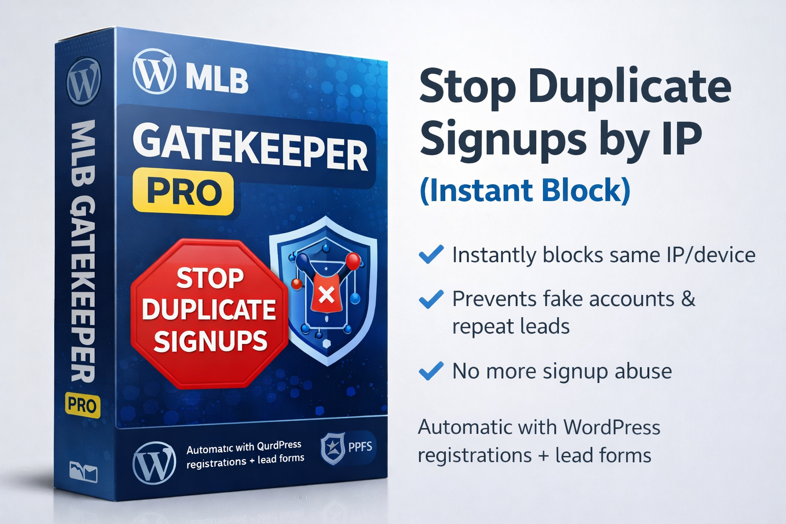 MLB Gatekeeper Pro blocks duplicate signups from the same IP/device before registration—helping you stop fake accounts, repeat leads, and signup abuse. Works automatically with WordPress registration flows and PPFS lead form protection, keeping your site clean and secure with minimal setup.